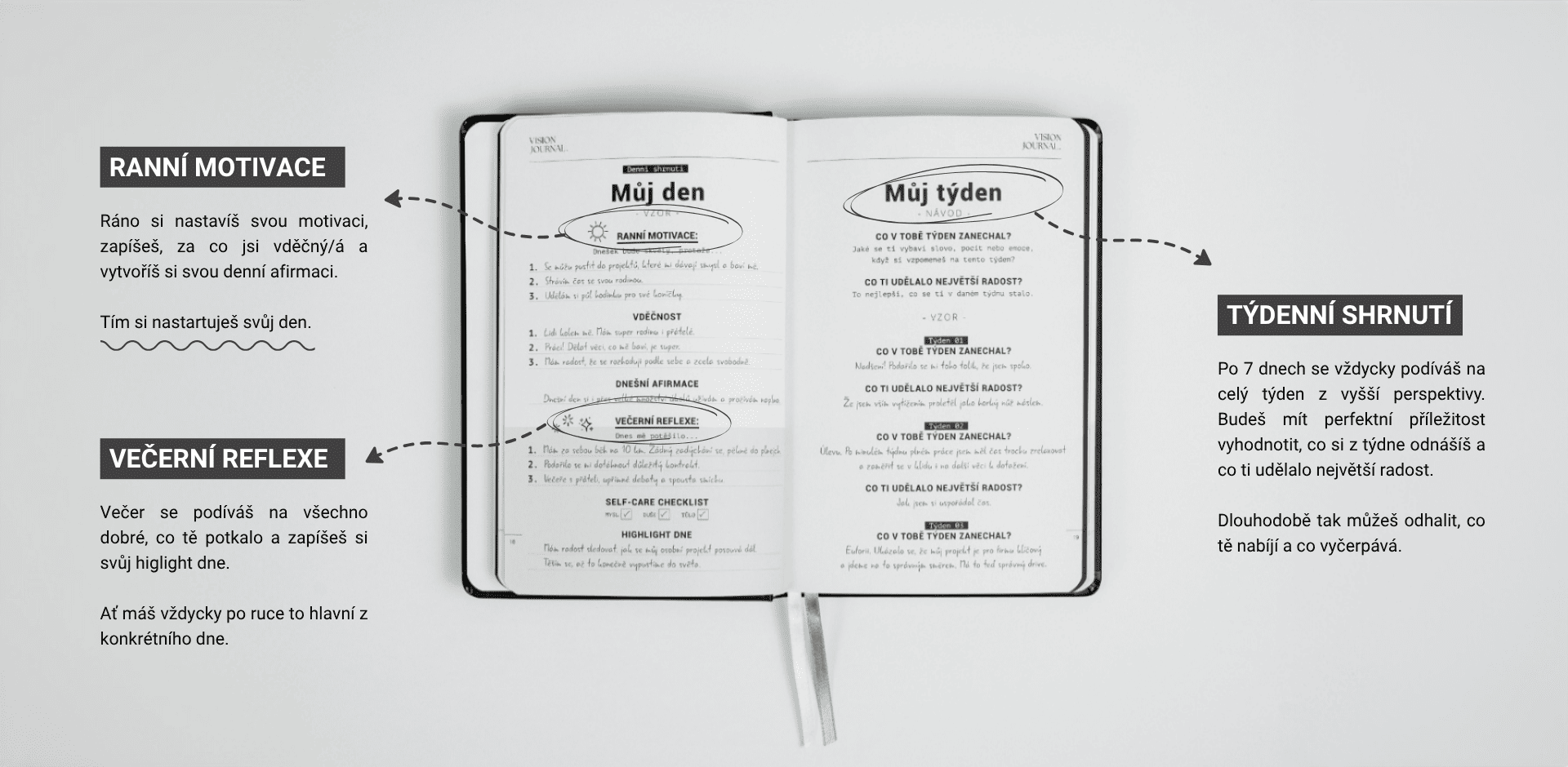 Večer si sedneš s čajem, otevřeš Vision Journal a zapíšeš si tři věci, které ti dnes udělaly radost. I ten nejhorší den má něco dobrého – jen to musíš vidět.